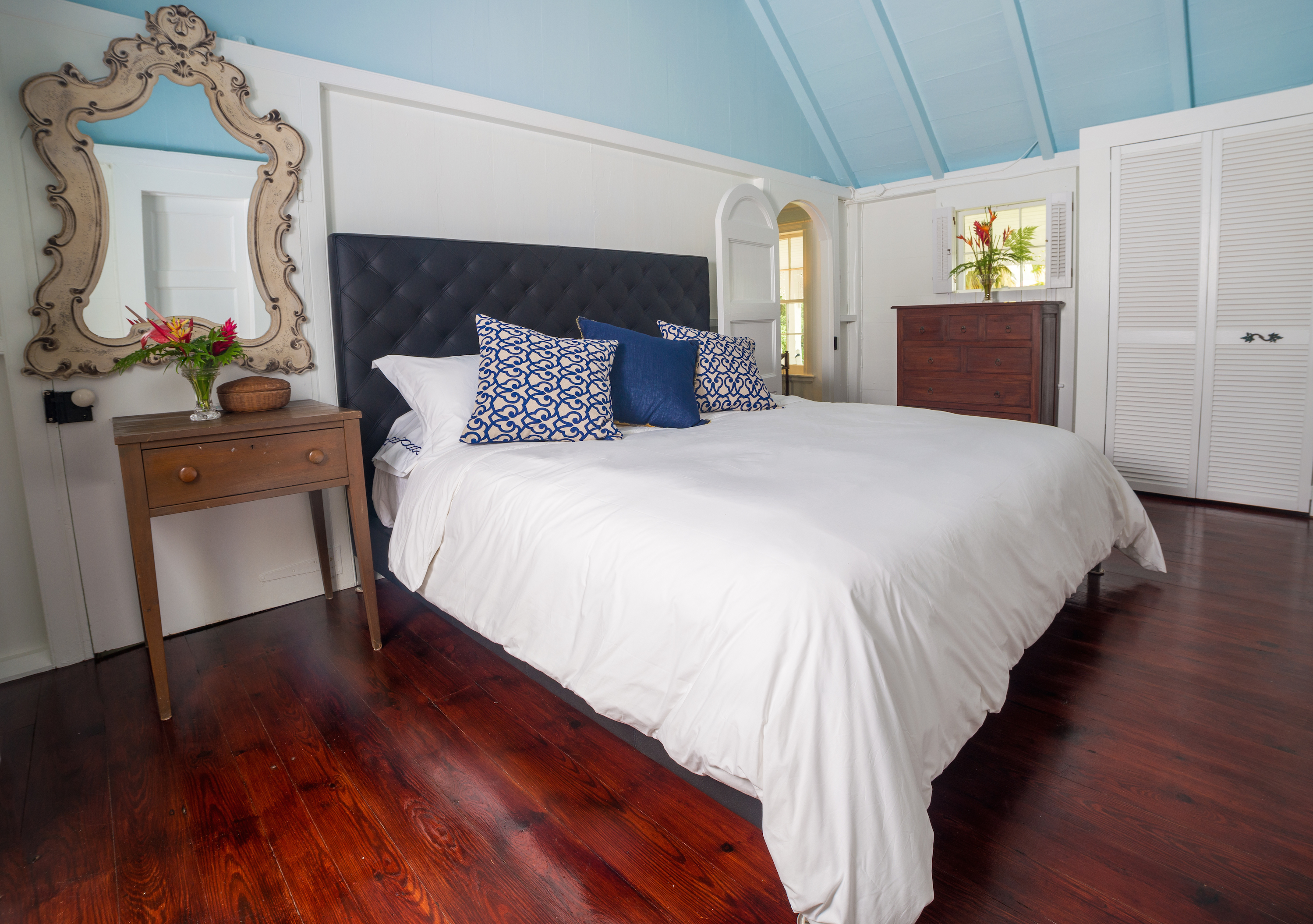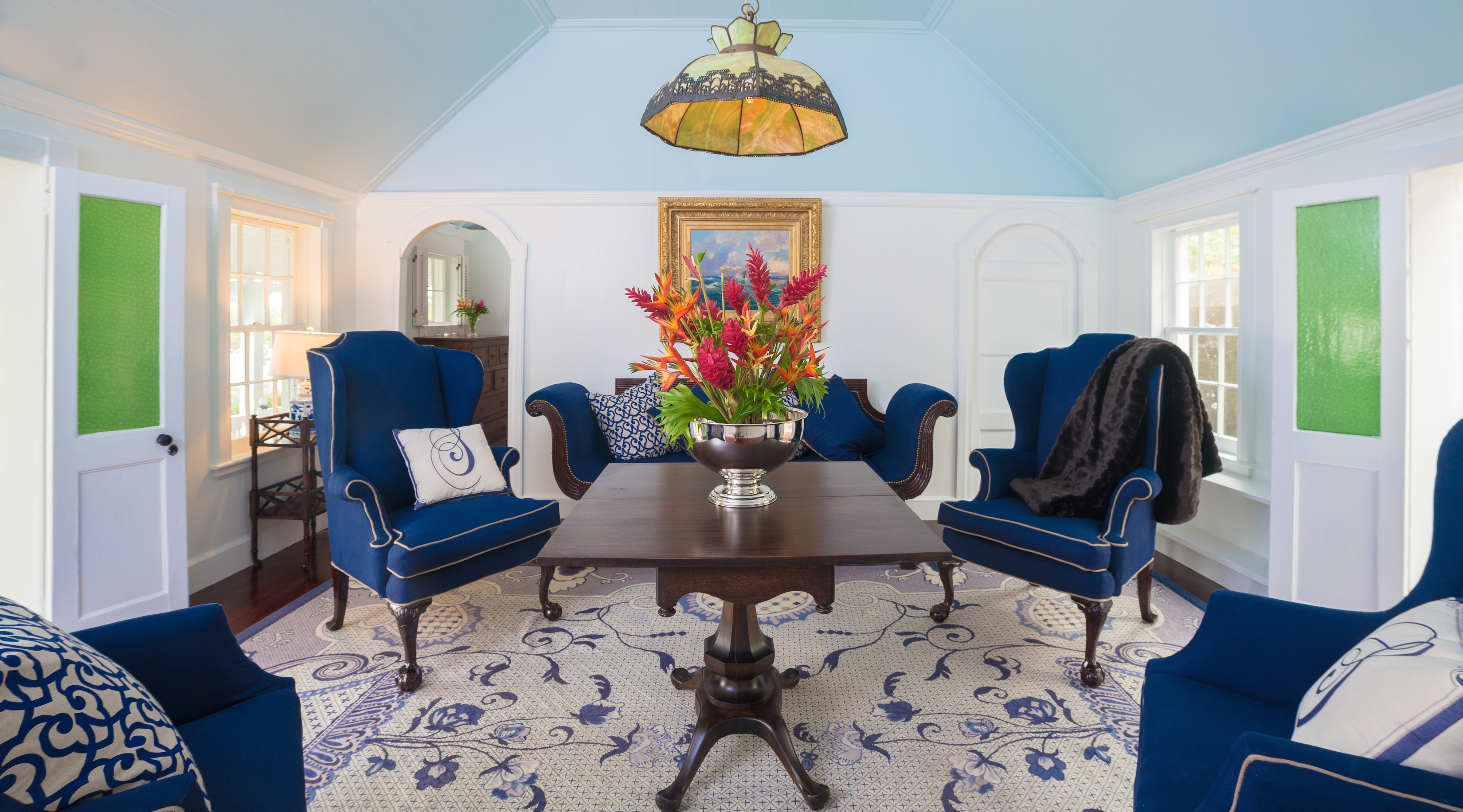 You enter the cottage’s cool interior through an exceptional arched porch detailed with the island’s fancy trim. Beautifully restored antiques elegantly and comfortably appoint the rooms. So many original features remain intact. Each exterior door retains the original stained glass. Richly patinaed vintage floors flow throughout the open, airy rooms, each painted in warm white with beautiful soft blue ceilings. The original interior curved doors open into each room.