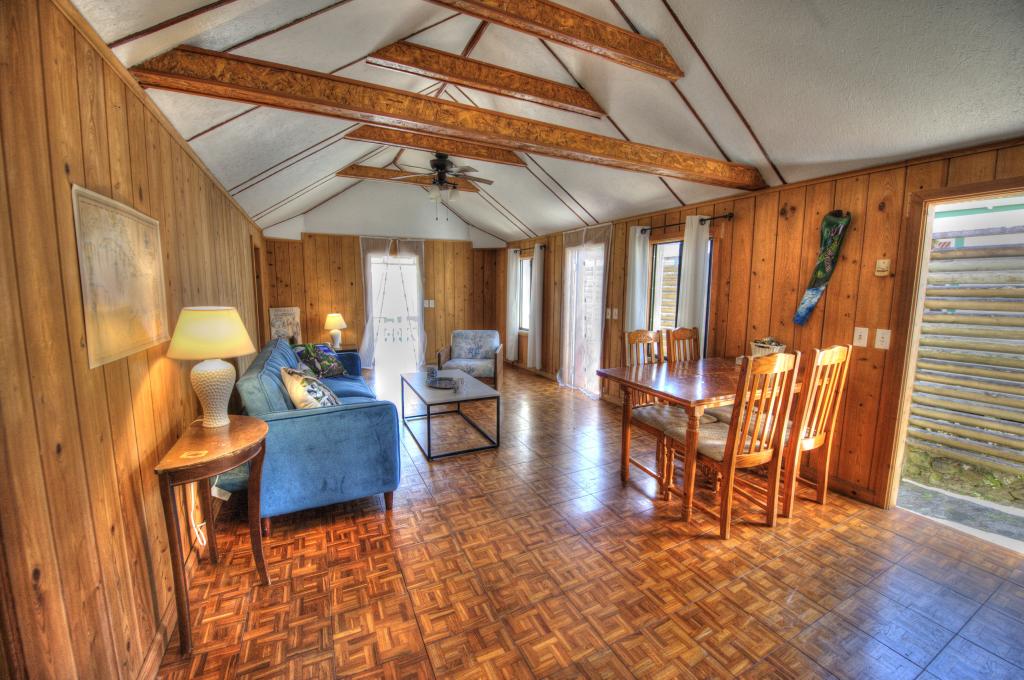A large veranda at the entrance of the cottage leads the way to the spacious living area. The design configuration features a partially open and updated kitchen with access via a double Dutch door to a private area that can be converted to more outdoor living space.