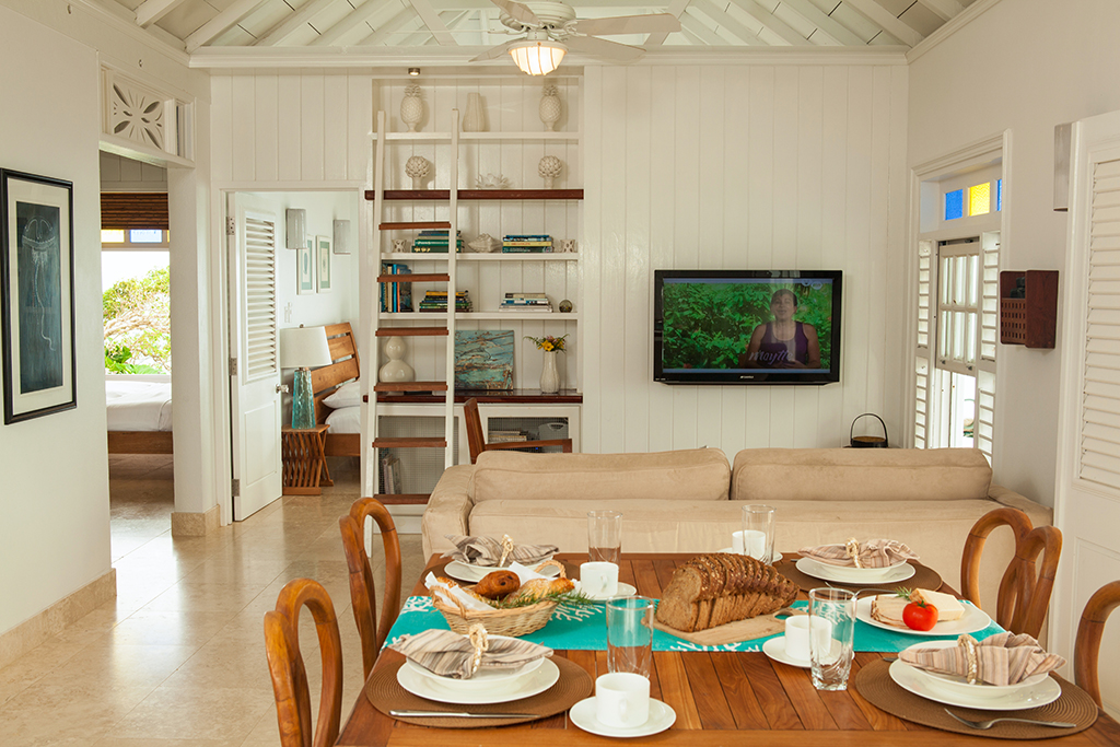 The main living space is a spacious open plan featuring a large gourmet kitchen detailed in traditional Saban stone used in the original island kitchens. Two large bedrooms have en suite large, well-appointed bathrooms. The villa features all the modern conveniences, including a handy pair of binoculars to bring the views in even closer.